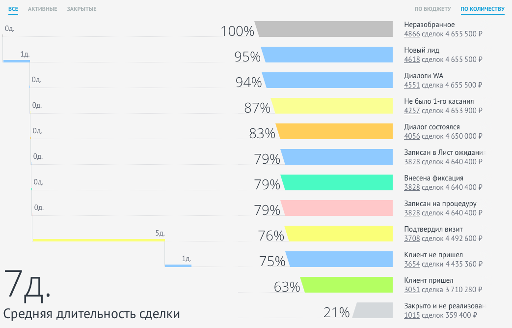 - Аналитика по каждому сотруднику, как по администратору, так и по специалисту занимает 2-3 минуты с получением ряда показателей