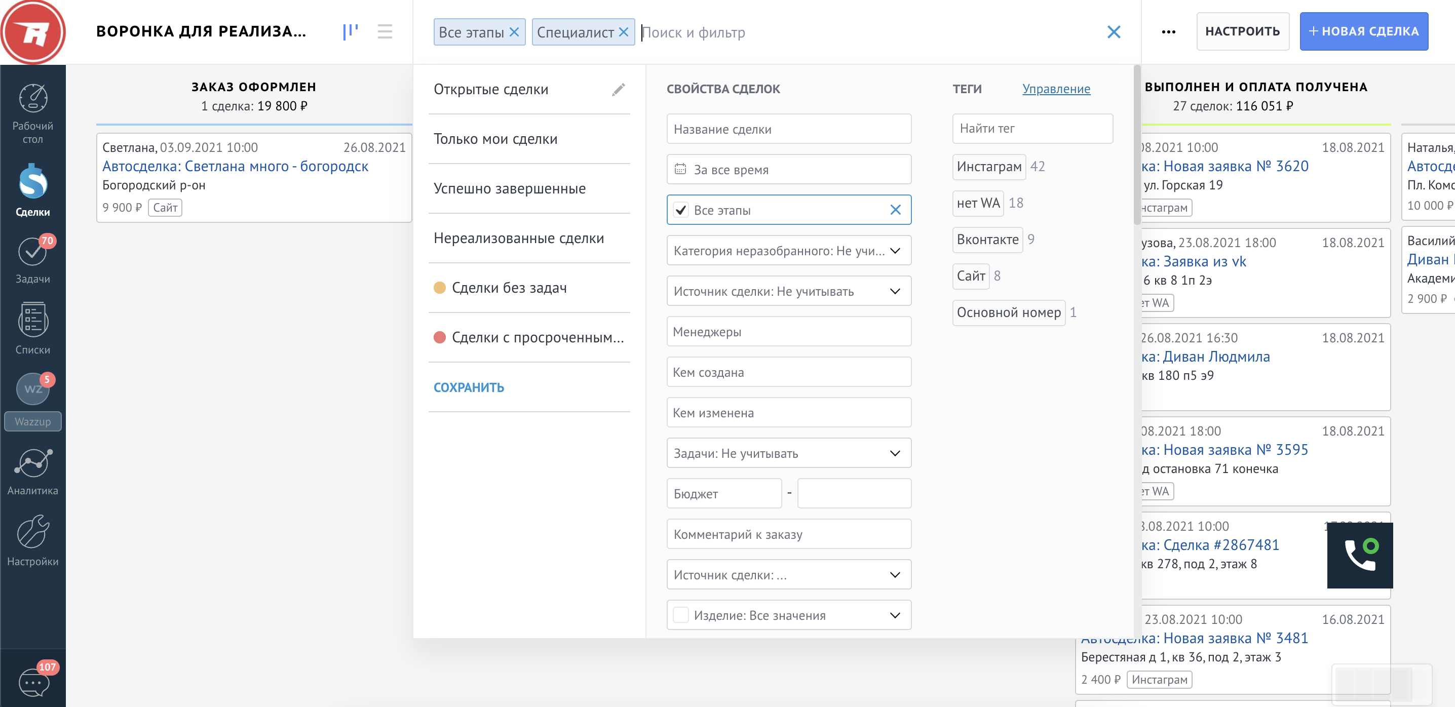 - Настройка воронок продаж