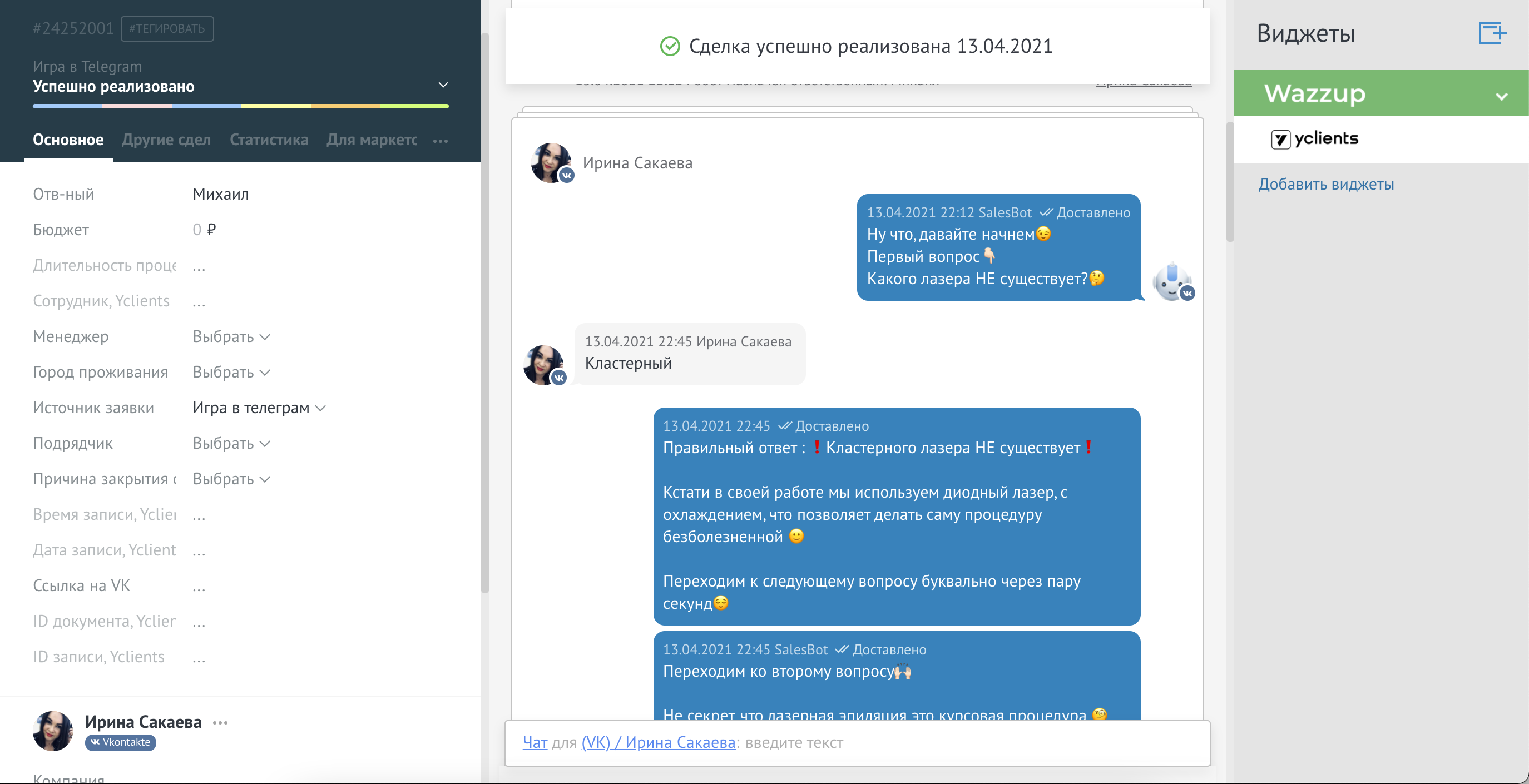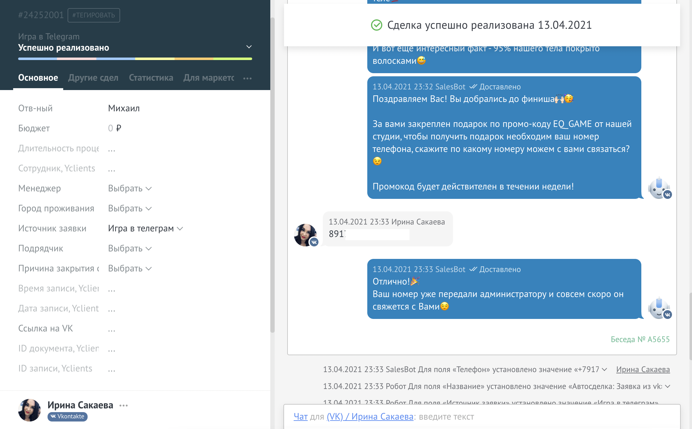 "И не мог бы подумать, что внутри CRM есть такой большой функционал который облегчает жизнь и освобождает огромное количество времени. Автоматизация отправки сообщений это вообще отдельный вид искусства. Работой доволен, сотрудничеством тоже доволен!"